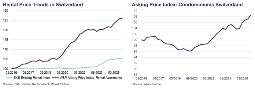 Transaction prices for residential property as well as rental prices have also continued to rise. The persistent supply shortage has driven prices up significantly over many years. The temporary interest rate effect in 2022/2023 merely slowed this dynamic slightly (Source: Wüest Partner).