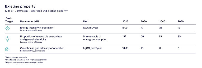 The long-term objective of the SF Commercial Properties Fund is to achieve the Federal Council's climate target for 2050 (net zero by 2050 at the latest) by implementing the climate-alignment sustainability approach.