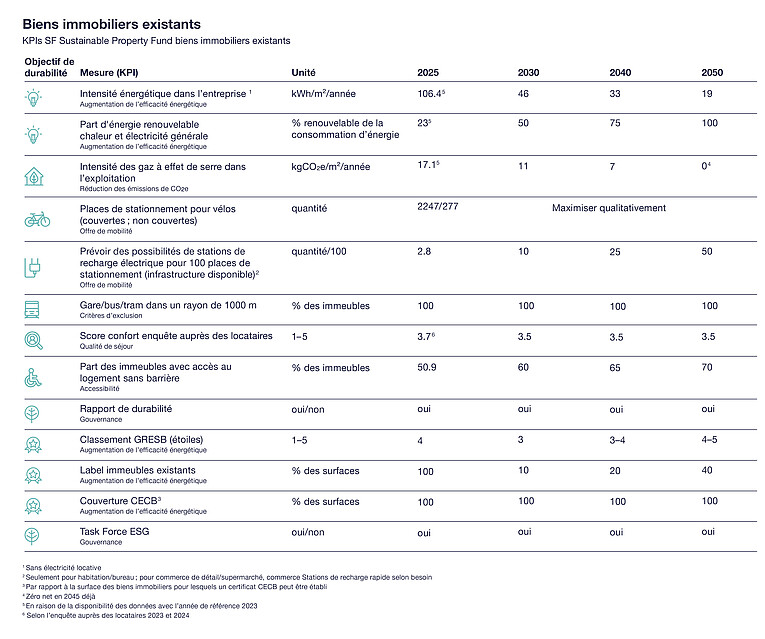 L'objectif de la stratégie de durabilité du SF Sustainable Property Fund est d'atteindre un bilan net nul d'ici 2050 au plus tard (objectif climatique 2050 du Conseil fédéral). L'effet visé doit être atteint par une combinaison d'approches de durabilité. Pour mettre en œuvre les approches de durabilité, des critères de durabilité et des indicateurs clés de performance correspondants ont été définis. L'accent est mis sur l'augmentation de l'efficacité énergétique et sur la réduction des émissions de gaz à effet de serre.