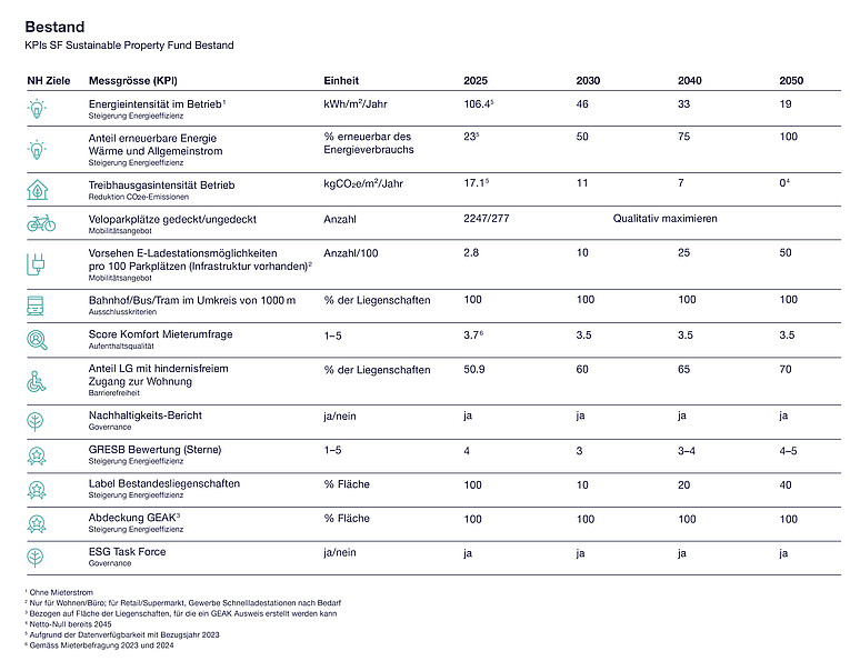 Der SF Sustainable Property Fund bezweckt mit seiner Nachhaltigkeitsstrategie eine systematische und schrittweise Optimierung der Liegenschaften hinsichtlich definierten Nachhaltigkeitskriterien. Im gesamten Anlageprozess entlang der Immobilienlebens- und Investitionszyklen werden ESG-Vorgaben systematisch berücksichtigt.